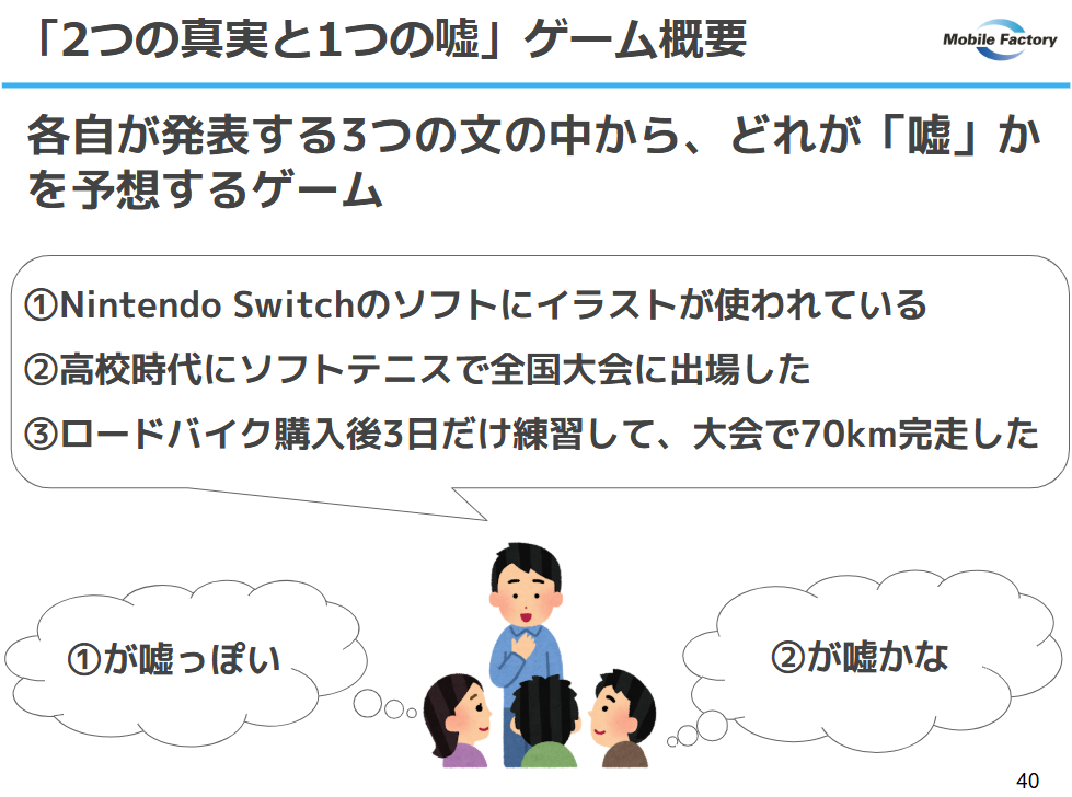 今回行ったのは、各自が発表する3つのエピソードのうち、どれが「嘘」なのかを当てる「2つの真実と1つの嘘」というゲームです。