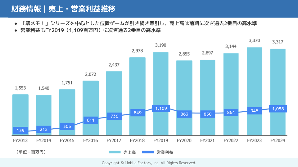 実際に、会社の事業は、携帯電話向けの着メロ等のコンテンツ事業からスタートして、メディア事業、ソーシャルアプリ事業、ブロックチェーン事業と、チャレンジと変化を繰り返してここまで成長してきました。現在は、主力事業である位置情報ゲーム「駅メモ!」や「駅奪取シリーズ」が10年以上にわたり多くのユーザーに愛され、モバファクの業績を牽引するサービスです。この安定した基盤こそが、会社の新たな挑戦を支える大きな強みとなっています。