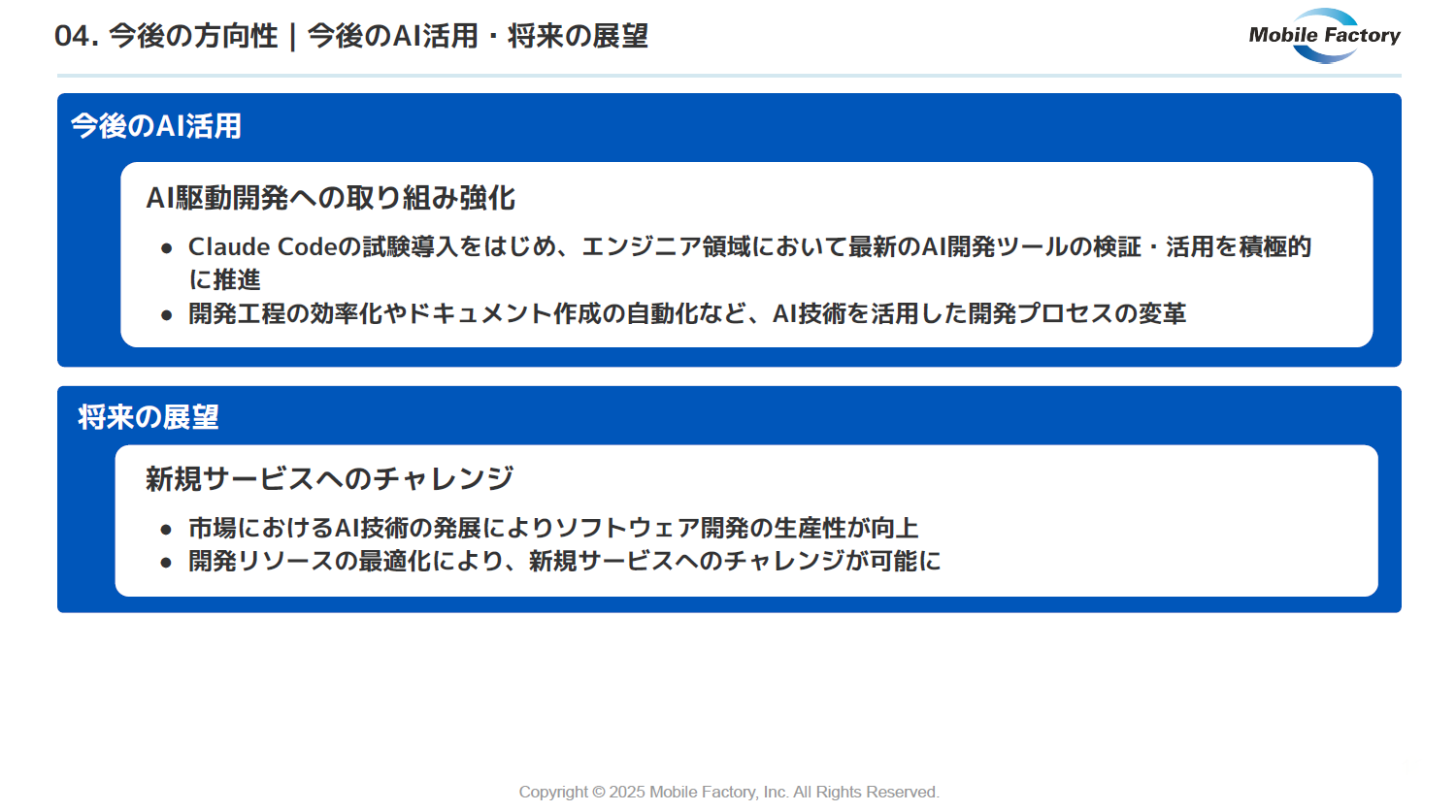 安定した基盤があるからこそ、AIをはじめとする最新技術の活用を積極的に推進しています。将来的には、AI技術の発展によってソフトウェア開発の生産性が向上することで、最適化された開発リソースを活かし、今後も変化をし続け、「面白い」や「楽しい」を世界中に届けていくため、新規サービスへも積極的にチャレンジしていく方針です。