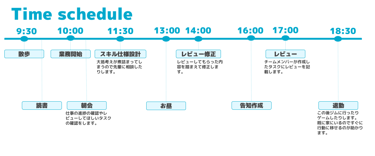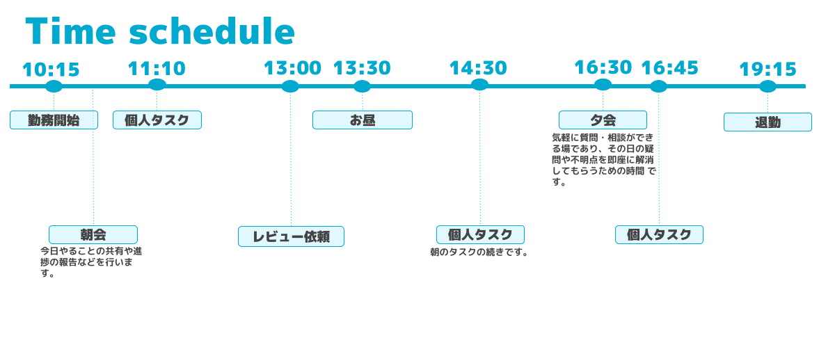通勤ゼロで業務を始められる効率の良さを実感しています。 また、普段はフルリモートで働き、出社時にはオンラインとはまた違うコミュニケーションをとることができて楽しいです。
