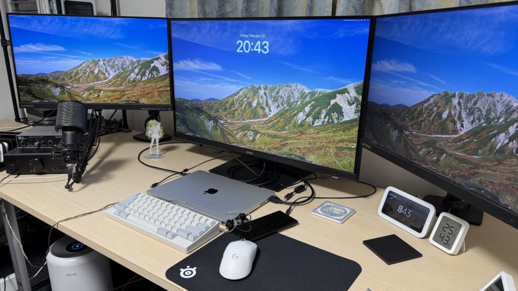 デスクについては、生活に必要なものを置く必要がないため場所の制約が緩く、メインの作業環境は1600×700の机に31.5インチ4Kを1枚と24インチWQHDを2枚置いており、横に1800×700 の机を置き、L字デスクにしています。